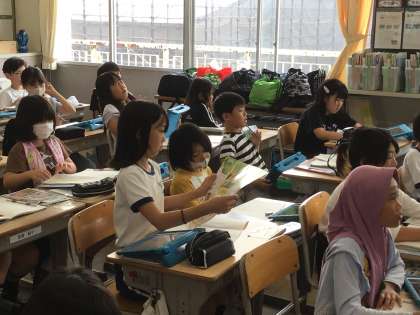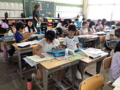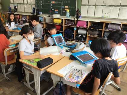 広告を読み比べて、学習用タブレットを使ってまとめています。