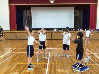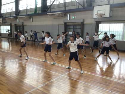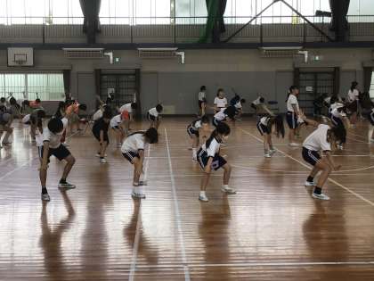 6年生が5年生に動きを教えたり、全体で練習したりしています。
