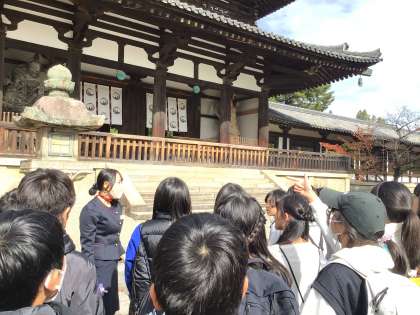 さわやかな秋空の下、6年生が修学旅行に出かけました。1日目の今日は奈良を訪れています。午前中はナガレ山古墳と法隆寺を見学し、昼食をおいしくいただきました。これから東大寺に向かいます。
