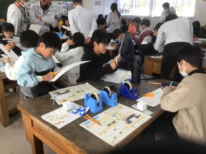 空気の抵抗について学んだ後、一人ひとりペーパークラフトで車を作って、実際にどれぐらいの空気抵抗があるか測定しました。