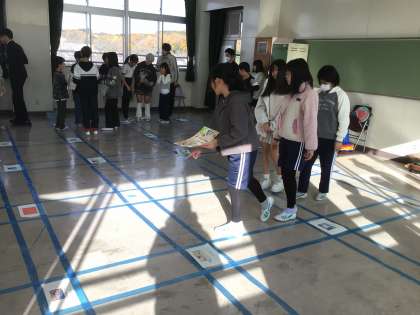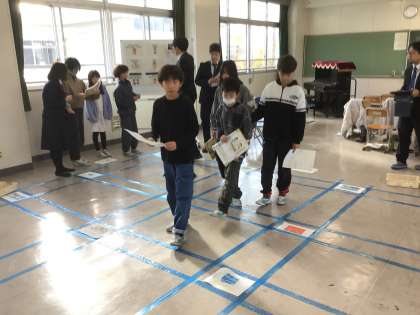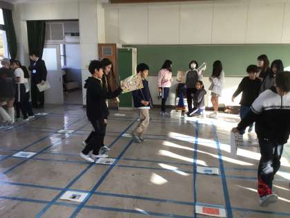 教室の床に用意されたオリジナルの地図に示された目的地まで、英語の表現を使って友達を道案内をしました。