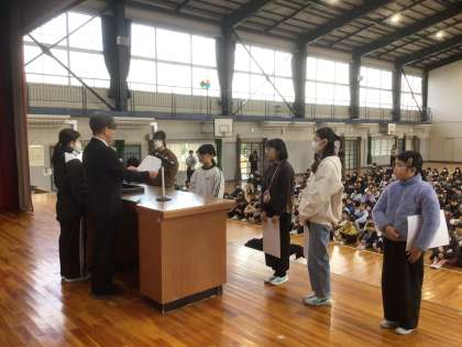 最初に、運動や作品応募で優秀な成績を収めた児童の表彰を行いました。