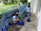 1年生が、アサガオの水やりをしています。 花が咲きはじめたようですね。
