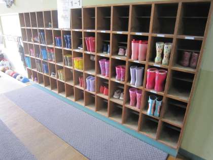 今日は一日雨のため、子どもたちは外遊びができず、教室で読書やお絵描きをして過ごしています。ふと、下足箱を見ると、履物の違いに気づきました。替えの靴下やシャツを持ってきている子どももいました。雨対策にも子どもの成長が感じられます。