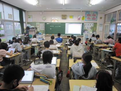 総合的な学習の時間に、6年生は「防災」をテーマに学習を進めています。今日は、これまで調べてきたことをプレゼンテーションソフトを活用してまとめました。画面に示すのか言葉で伝えるのかを吟味したり、画面構成を考えたりしながら作成します。今後、発表を通して聞く人の反応から自分の伝え方を振り返ることで表現力を高めていきます。