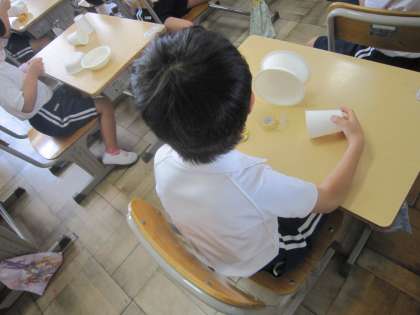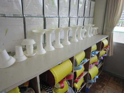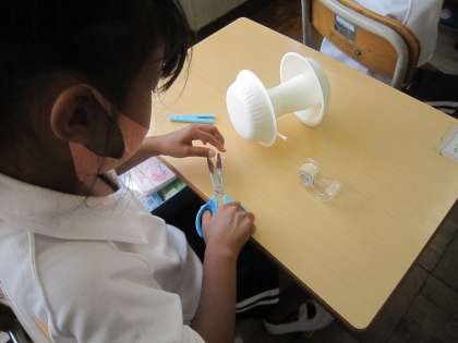 1年 図画工作科「かみざら ころころ」 公開日 2021/06/03 更新日 2021/06/03 各学年から 紙皿2枚、紙コップ2つを使って転がるおもちゃ作りをしました。子どもたちの発想には驚くばかりで、何通りもの組み合わせを見ることができました。さて、よく転がるのはどんな形でしょうか。