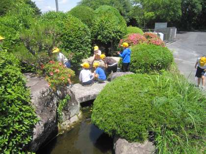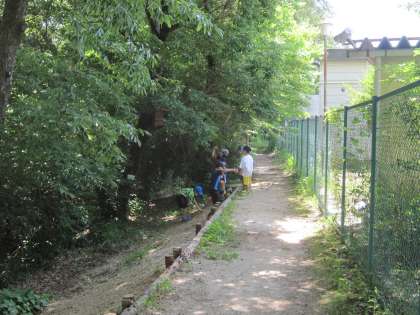1年生は、最近になって池の周りがお気に入りのようです。メダカを草で釣ろうとしたり、木の実を採ったりして遊んでいます。