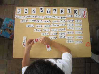今日は、たしざんカードを使っての学習です。答えが同じになるものを仲間分けして並べます。順番に並べていくと「階段みたいになってる」「だんだんカードが増えているよ」と気づいたことをつぶやいています。この気づきがたしざんの理解につながっていきます。