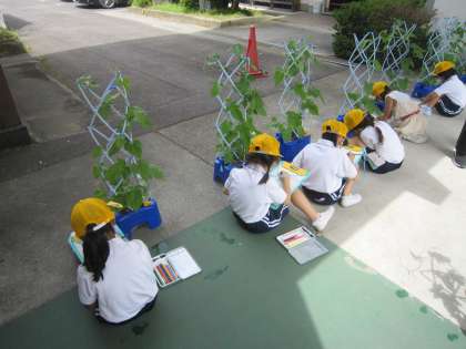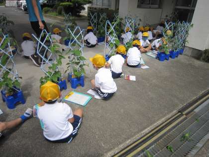 毎日の水やりを続けてきたことで、支柱の上までつるが伸びるほど大きく成長しています。子どもたちが記録する用紙にも大きな葉っぱが描かれています。葉の色と茎の色を分けて塗っているところに、よく観察できていることが伺えます。