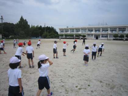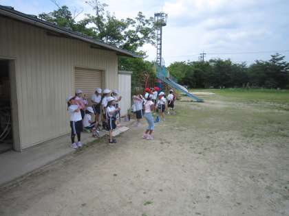 これまでぎざぎざコースを走ったり、くるくるコースを走ったりしてきましたが、今日は2人で競争です。ゴールの近くで競えるようにスタート位置を調整してスタートします。とても暑いため、マスクを外し、10分おきに日陰で水分補給もしています。