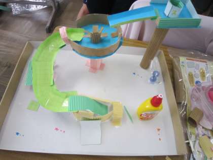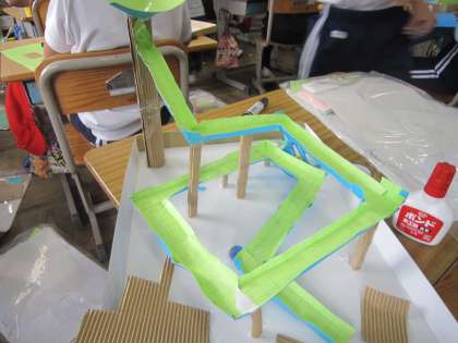 完成に近づいているようです。イメージが具体的な形になってきました。ビー玉が思うように転がらない部分を修正したり、新しい道を付けたしたりしています。みんなで遊ぶのが楽しみです。