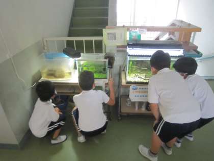 1年 雨の日の休み時間2 公開日 2021/06/25 更新日 2021/06/25 各学年から 生き物の観察をして過ごすこともあります。左の水槽にはザリガニ、真ん中の水槽にはヌマエビ、右の水槽には岩本川で捕った魚やドジョウがいます。最近、ザリガニの赤ちゃんがたくさん生まれ、1年生の注目を浴びています。