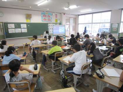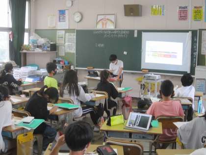 プレゼンテーションソフトを活用して調べたことをまとめ、発表が進んでいます。プロジェクターで映し、スライドさせながら原稿を読み上げます。聞き手は、発表の内容や仕方についてメモをしながら聞き相互評価をしていきます。