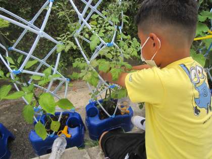 ふれあいの時間に野菜を収穫していました。ミニトマトを採り、大事そうに抱えていました。家に持って帰り、家族と食べると教えてくれました。楽しい食事の時間になりそうです。他にもきゅうりやなすが大きく育っています。