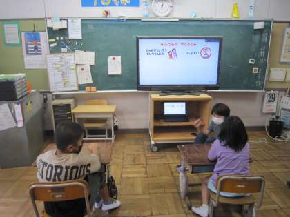 今日は、6年生と特別支援学級で水泳・水遊びの心得を学ぶ授業が行われました。1つの内容を学ぶとアプリを使って確認クイズをします。クイズでは「ブッブー」と不正解時の音が多く聞こえてきました。「えっ!」と驚くとともに正解を確認して、納得していました。判断材料がたくさんあることを改めて学んだようです。
