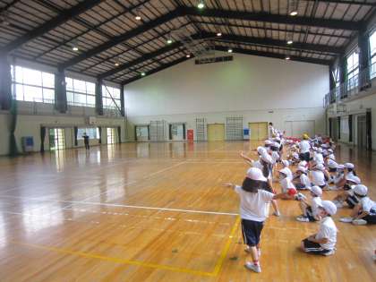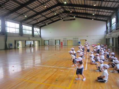 玉入れの玉を使って、遠くに投げる方法を考えました。玉の持ち方を考えたり、「ビュン!」と投げたりするなどいくつかの方法を試しながら、一番遠くまで投げられる方法を見つけていきます。