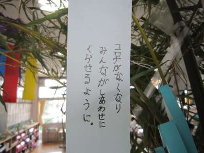 短冊に願いを込めて 公開日 2021/07/06 更新日 2021/07/06 各学年から 明日の七夕に向けて、飾りをつけたり、短冊に願いを書いたりしています。その中に心温まる願い事が書かれていました。子どもたちの願いがかないますように。 写真:4年1組