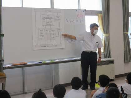 校長先生から6年生へ「進路」のお話をしました。 公開日 2021/07/09 更新日 2021/07/09 校長室から 7月8日の5時間目に6年生全員に 「進路」について校長先生から話をし ました。 今日は、中学校卒業後・・・を考え ました。希望する職業に(社会人とし ての生活)つくにはどういう道がある のかを知らせて、今から何を目標に、 今できることは何かを考える時間を もちました。
