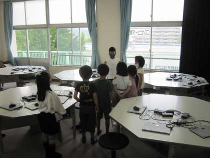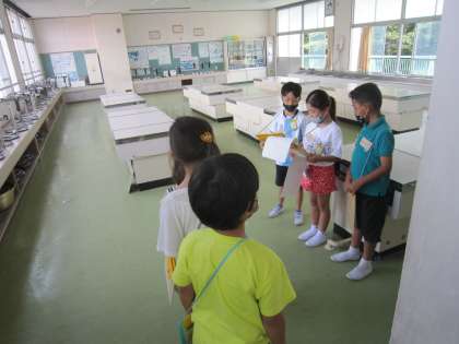 調理室・コンピューター室・音楽室を紹介しています。どんな時に使うのかを説明したり、3択のクイズを出したりしていました。1年生にも分かるように言葉を選んでいる姿も素敵でした。