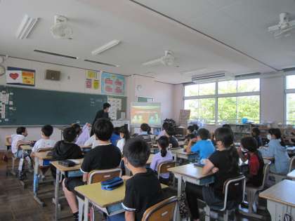 情報モラル学習の2回目として、5年生では「フィルタリングは必要なのか」について考えました。子どもたちからは、「使ってないから不要です」「子ども向けではないものを避けるために必要」「調べたいことが見られなかったら嫌だから」と様々な立場での意見が出されました。話し合い後、タブレットの「NETモラル」アプリで動画を視聴し、タブレットを安全に使うための理解を深めました。