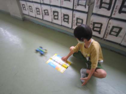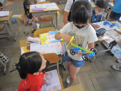 「先生見て!見て〜!」と声をかけられ教室に入ると、プロペラを回してゴムをねじっていました。そして、ゴムの力で動く車を勢いよく走らせて見せてくれました。ものすごい勢いに誇らしげでした。