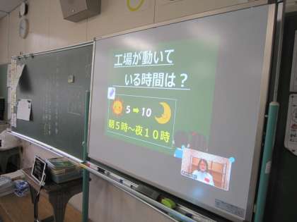 画面越しでスタッフの方が、丁寧に教えてくれました。一日に作られるマヨネーズやドレッシングの本数、その材料で使われる卵の数を聞いて、子どもたちは驚いていました。