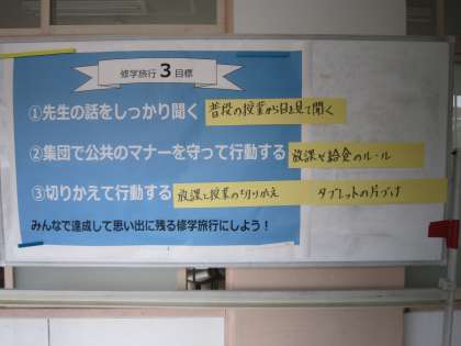 5年生のONE-DAYキャンプに続き、6年生が修学旅行に向けて動き出しました。6年生教室前の廊下に目標が大きく掲示されています。感染症拡大防止のため、今後どのような形の修学旅行になるか分かりませんが、最大限の準備をしていきます。