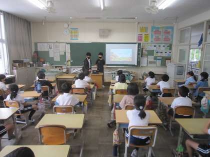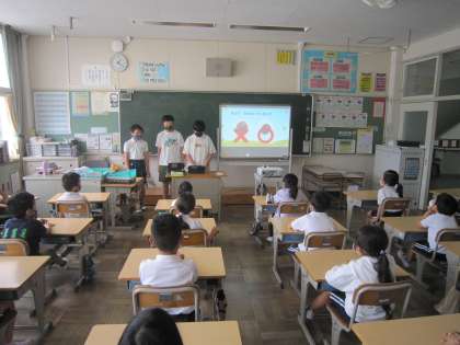 それに先立って、6年生がプレゼンテーションソフトを使って、どんぐり拾いのコツを2〜5年生に伝えました。