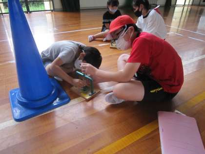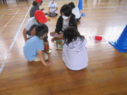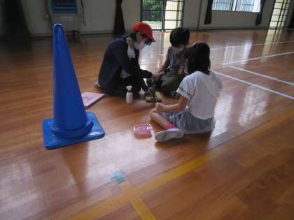 6年生が1年生に教えるため、密にならないように体育館で行いました。