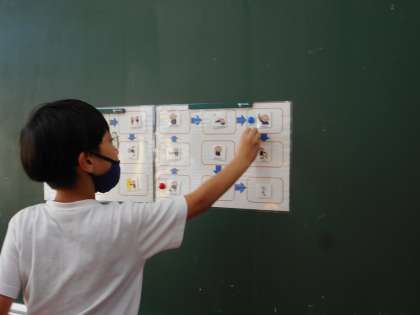 7組は、「いいこと・わるいこと」について考えました。その後で、実際の場面として双六遊びを行い、仲良く遊ぶことやルールを守ることなどの「いいこと」について実践しました。