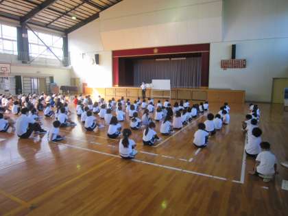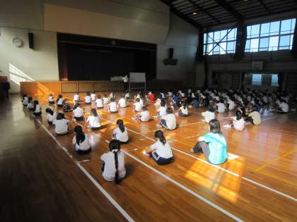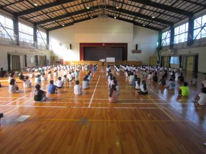 40分近く体操座りをして、表彰や校長先生のお話を聞きました。とても長い時間でしたが、1年生から3年生までこれまでの前期のがんばりが姿勢に表れていました。