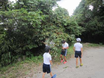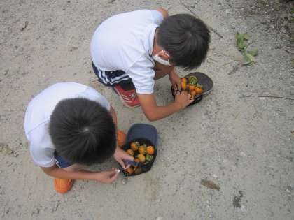 これまで、誰も食べなかった柿。3年生が収穫して持ち帰り、「おいしかった」と口コミで広がり、今日も収穫。持ちきれなくなると、帽子を入れ物代わりに…。たくましいです。