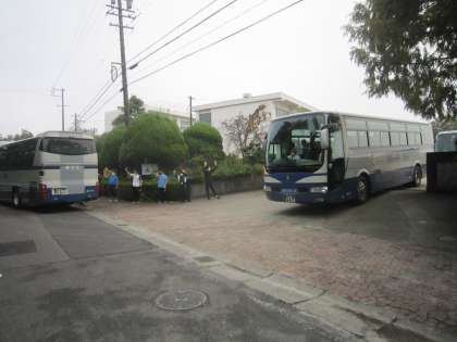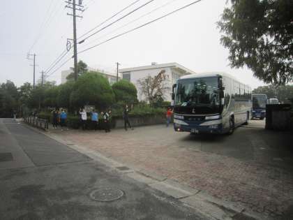 バスに乗り込んで、いざ、京都・奈良へ。 保護者や教師に見送られて出発です。無事に帰ってきてください。