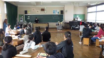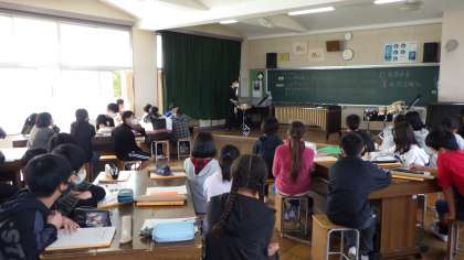 打楽器の演奏は、「見ても聞いても楽しめる」と教えてもらいました。また、「聞く人によって思い浮かべる風景はそれぞれ違うところもおもしろい」という曲の演奏もあり、子どもたちは、打楽器の音色に聞き入っていました。
