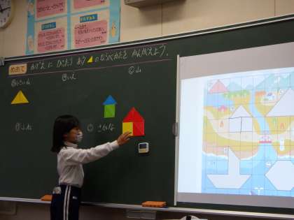 教科書にある影絵を見て、三角形のピースを組み合わせて同じ形を作りました。