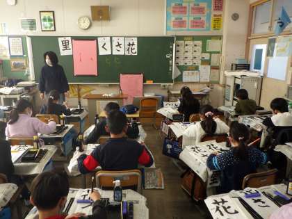 毎年、書き初め練習が始まる時期に、市の書道連盟所属の方がボランティアとして指導に来てくれています。今年は、3年生から6年生までが、冬休みまでに2回ずつ指導を受けます。