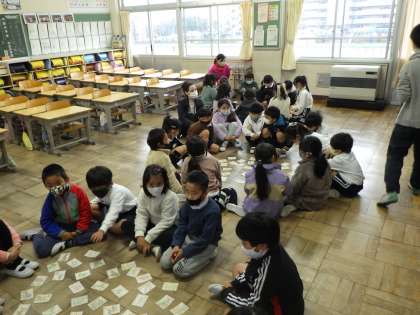 1年生は、今年が初めてのやまびこカルタです。これから6年間練習していく中できっと暗記してしまうのでしょう。まずは、学級で仲間と練習です。