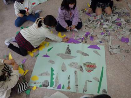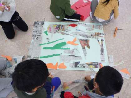 新聞紙や画用紙を指で破り、偶然できた形を使って作品を作ります。グループで制作することで、仲間の考えにふれたり、仲間と相談したりして協働的な学習になります。