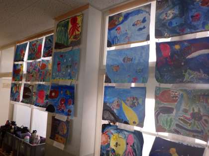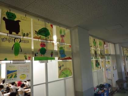 全学年、読書感想画が廊下に掲示されています。まるで美術館のようです。