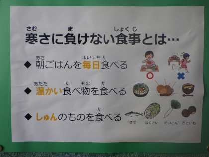 「寒さに負けない」をテーマに、温かいものや旬について説明があります。