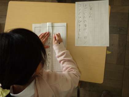 行がずれないように、手本を折り曲げています。