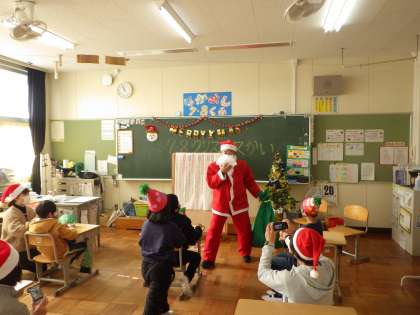 いつものように「あわてんぼうのサンタクロース」を歌っていると、本当にサンタクロースがやってきました。子どもたちは、これまでの授業で練習してきた「きよしこの夜」のベル演奏を聞かせてあげました。