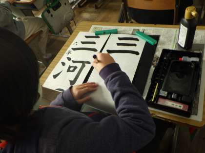 「三河の城」を書きます。画と画の間隔やはねる向き、止めるときの溜めなどたくさんのポイントを意識して書くため、とても集中力が必要です。さすが6年生です。