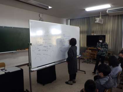 壁画家・紙芝居作家である松井エイコ氏を講師としてお招きし、平和な未来を考える授業を6年生が行いました。
