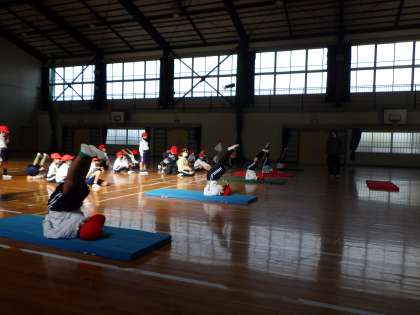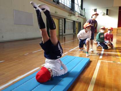 「まるたころがり」や「ゆりかご」、「だるまころがり」「まえころがり」など今後のマット運動につながる動きばかりです。