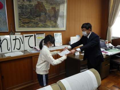 全校集会や分散集会が行えないため、お昼の放送で全校に披露しました。その後、受賞した子どもは、校長室で校長先生から賞状を手渡されました。