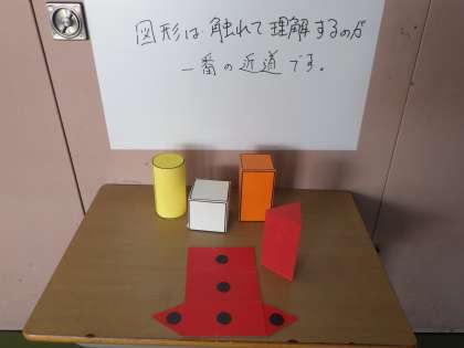 どの面とどの面がくっついているのかな。何枚の側面からできているのかな。教科書やタブレットだけではなく、実際に触ってみることで立体の感覚を養うことができます。