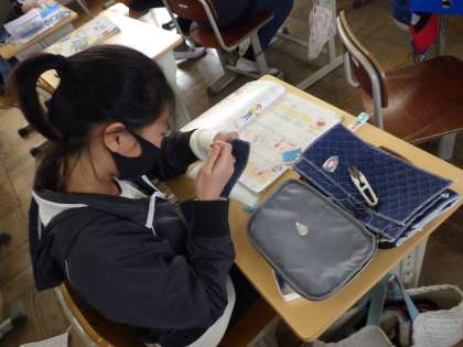 玉結び、玉止めに苦戦していた子どもたちが、今はミシンの糸通しに苦戦しています。できることが増えると、また次の壁が現れるようです。学びの連続です。