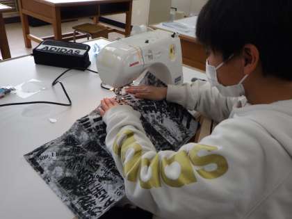 ミシンを使って、ウォールポケット作りをしています。
