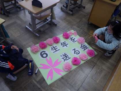 送る会を行う予定の各教室用の掲示物を作っています。紙の花を丁寧に開いたり、バランスよく文字を張り付けたりしました。